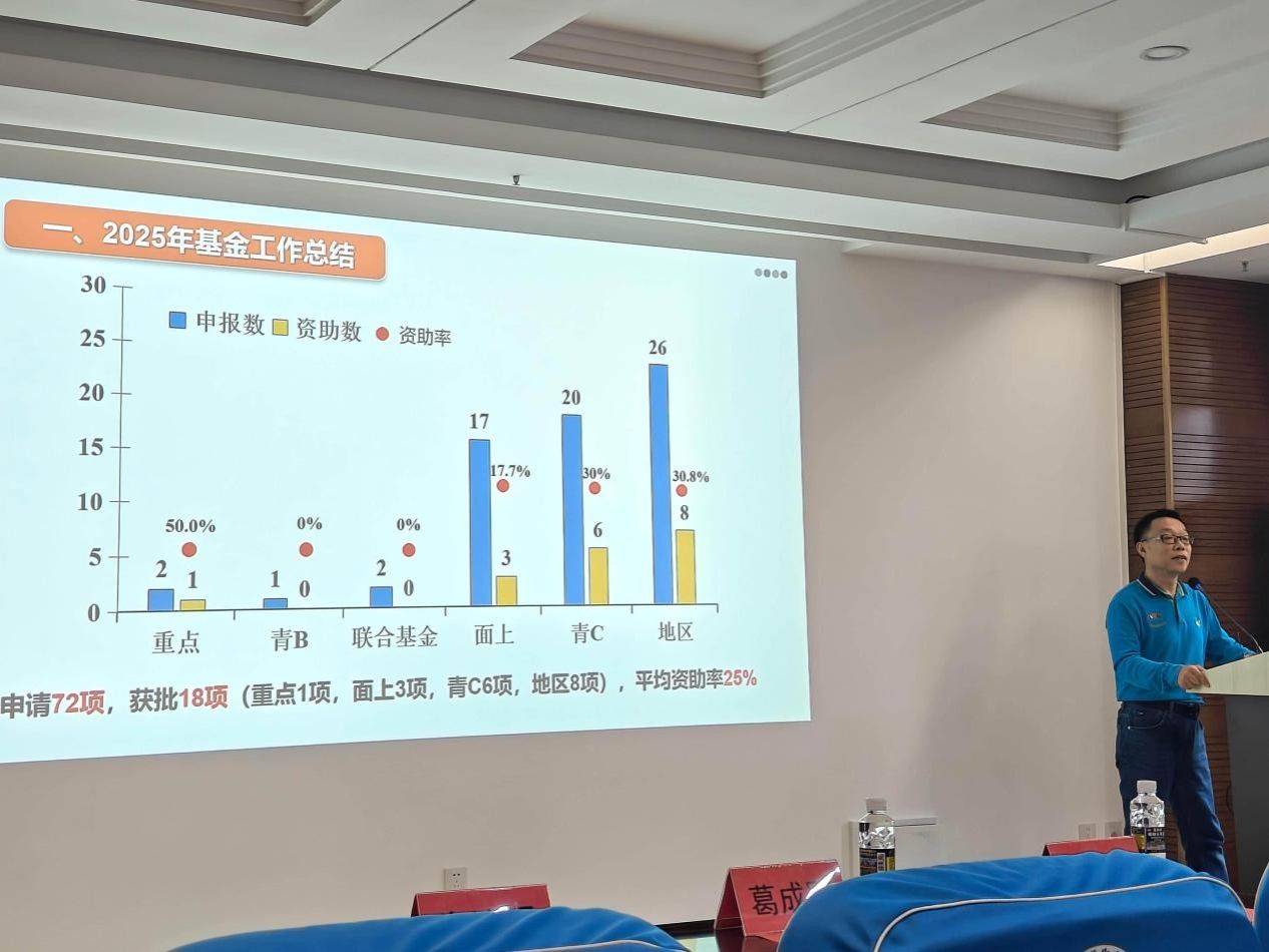 朱治强介绍了学校和学院的基金获批情况,通过复盘2025年的基金申报工作,重点从项目申报及获批的所属学部、项目类型、项目评审意见问题及其改进建议等几个方面,总结申报中的问题点,并针对性地提出2026年的工作计划,将从一对一辅导、团队研讨、传帮带等多个层面,指导老师们的基金申请书写作和打磨。