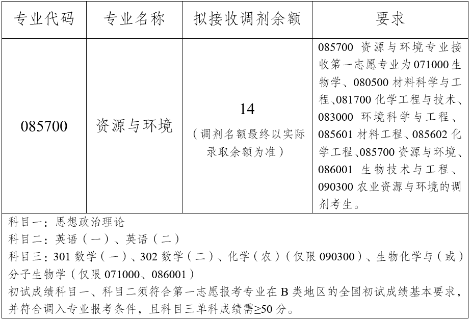 根据2025年研究生招生计划和一志愿复试、第一轮调剂复试情况,我院资源与环境专业(085700)尚有一定调剂名额,可接收考生调剂申请。相关情况如下: