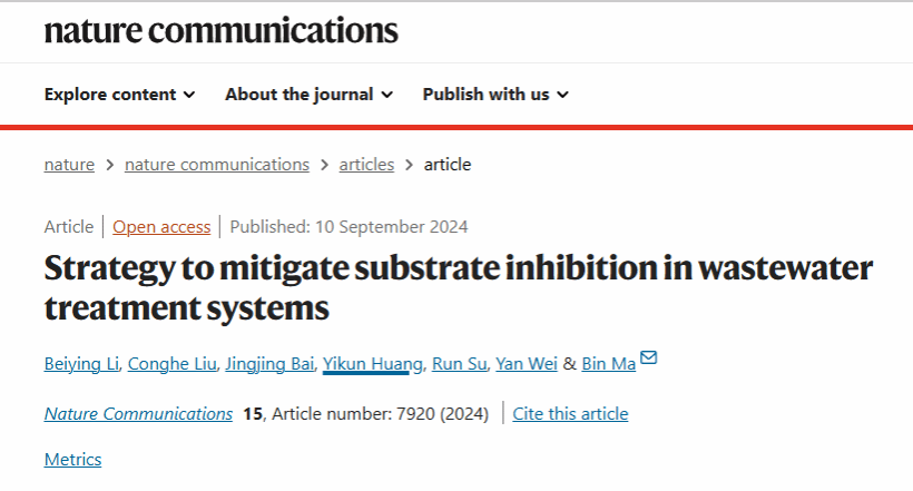 2024年9月10日,高水平学术期刊《Nature Communications》刊发了yl7703永利马斌研究员团队的研究成果“Strategy to mitigate substrate inhibition in wastewater treatment systems”。海南大学博士生李倍莹为该文唯一第一作者,马斌研究员为独立通讯作者。